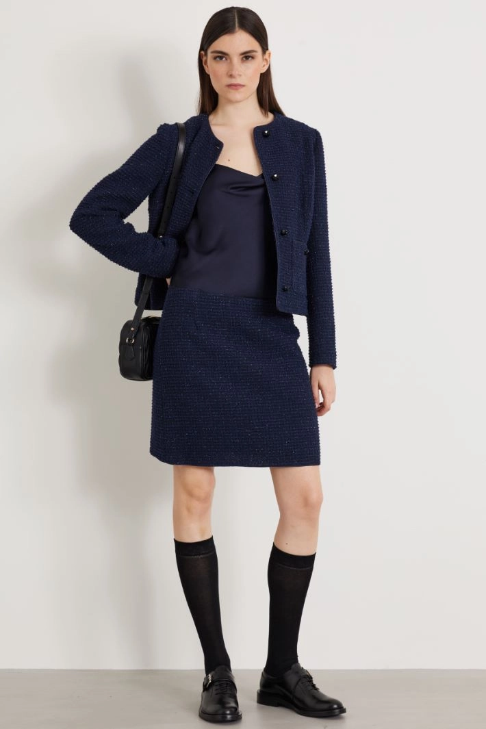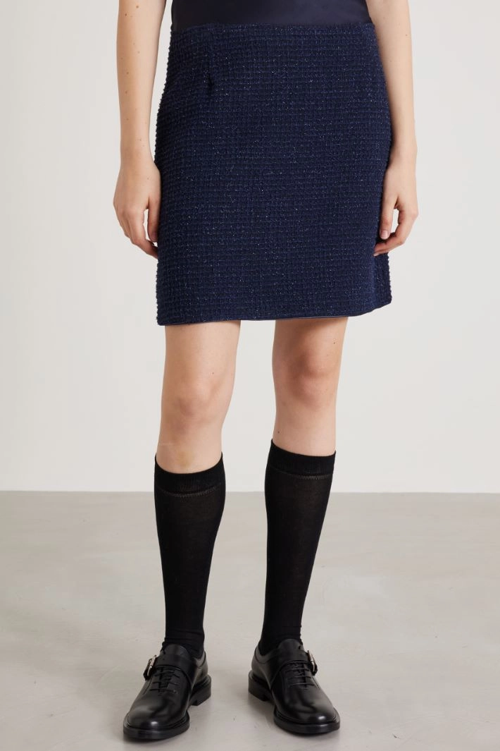 Regular-fit miniskirt in lamé cotton blend, with invisible zip fastening on the side. Lined.