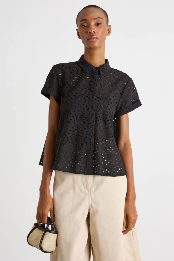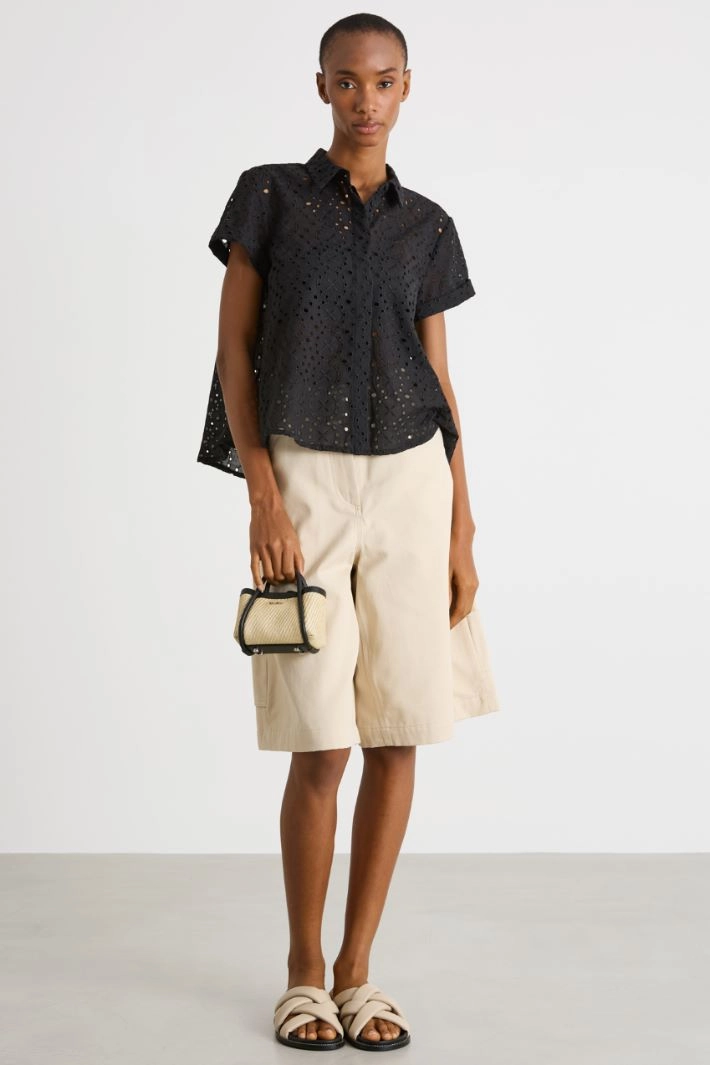 A-line shirt in broderie anglaise cotton, with a classic collar and short sleeves with turn-up cuffs. Unlined. Concealed button fastening.