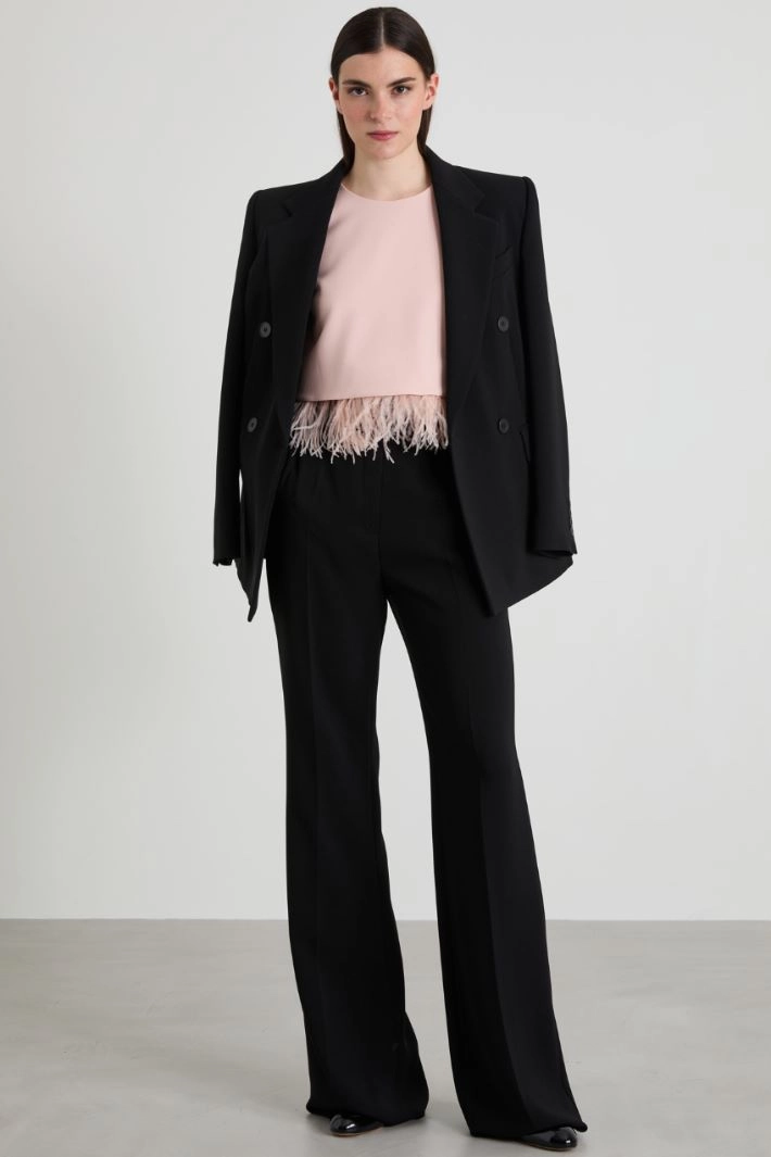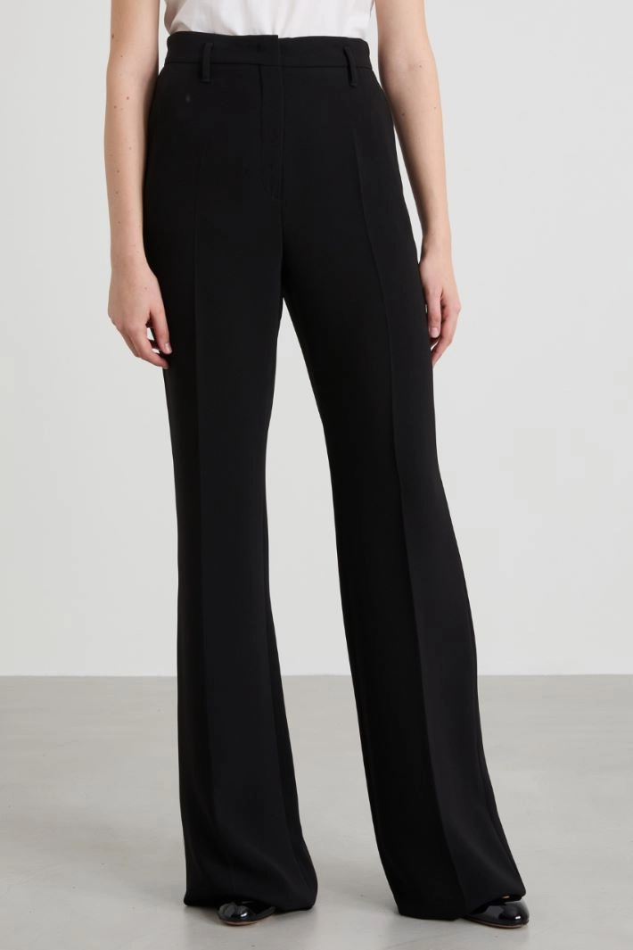 Straight-cut cady trousers with belt loops at the waist, French pockets at the front and double-welt pockets with button at the back, and crease pressed lengthwise. Hidden fastening with zip, button and hook.