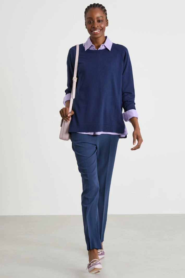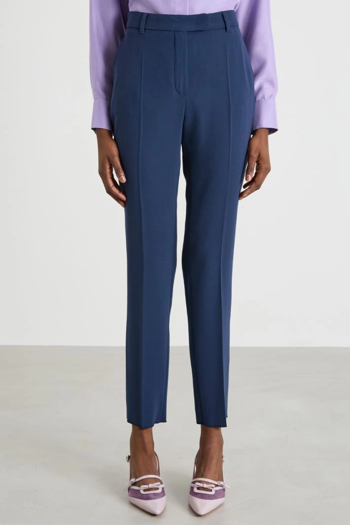 Cigarette cady trousers with piping, belt loops at the waist, side French pockets, crease pressed lengthwise and hidden fastening with zip, button and hook.