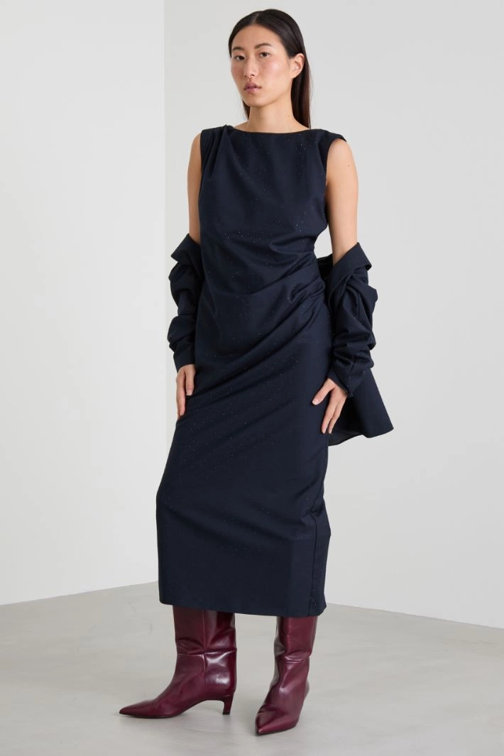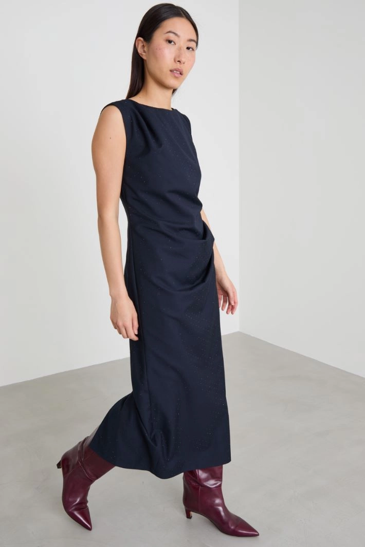 Straight-fit dress in viscose blend Levantine, with tone-on-tone micro rhinestone motif applied all over, boat neckline and draping on the side. Central slit and fastening with invisible zip on the back. Lined.