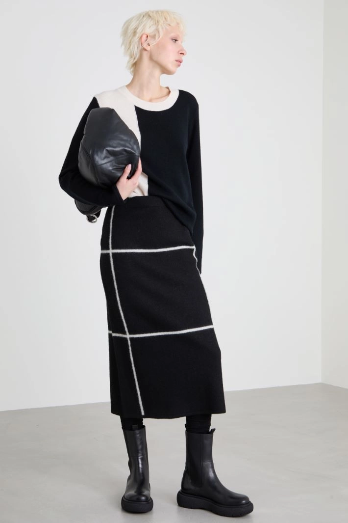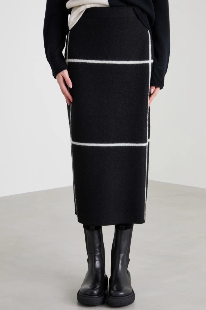 Straight-cut midi skirt in pure boiled wool, with inlay work and elasticated insert at the waist.