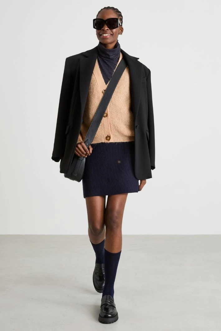 Regular cropped cardigan in mohair blend yarn, with ribbed knit, V-neck, long raglan sleeves. Button fastening.
