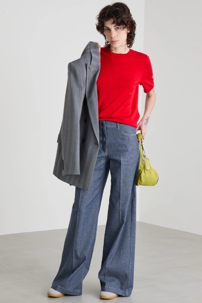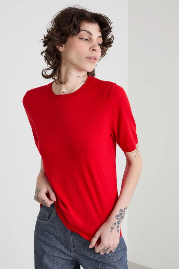 Straight-cut sweater in silk and cashmere yarn, with crew neck, short sleeves and ribbed trim.