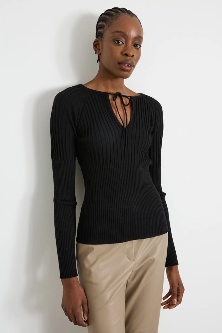 Fitted sweater in pure wool yarn, with asymmetrical ribbed knit, crew neck with V-neckline finished with drawstring and long raglan sleeves.