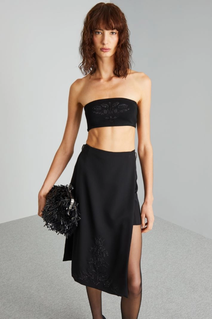Bandeau top in a soft stretch viscose knit, embellished with a thread and bead embroidery on the front. Finished with ribbed edges.