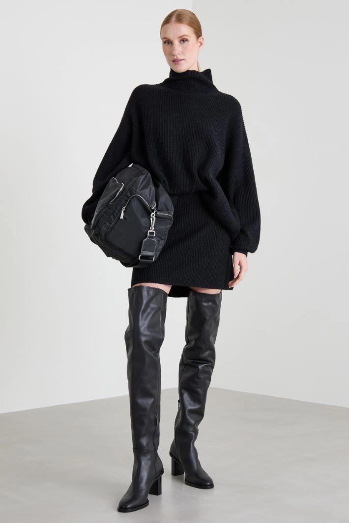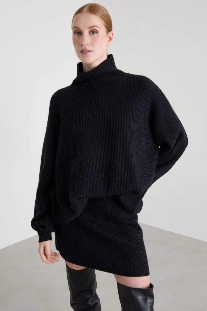 Long, oversized sweater in wool and cashmere yarn, with ribbed knit, crater neck and long, dropped sleeves.