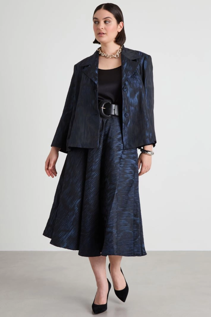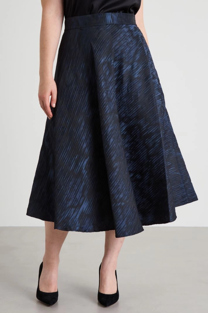 Flared skirt in lamé fabric with invisible zip fastening on the side.