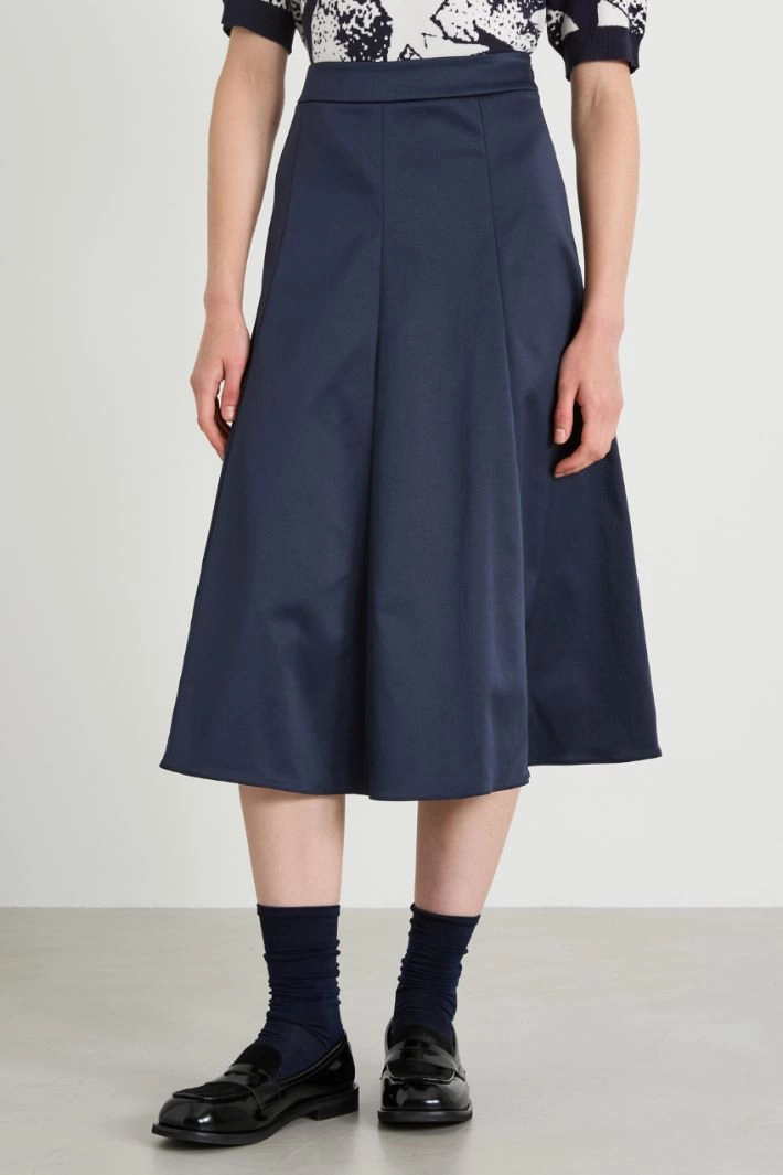 Flared panelled duchesse skirt with invisible zip fastening and hook on the side.