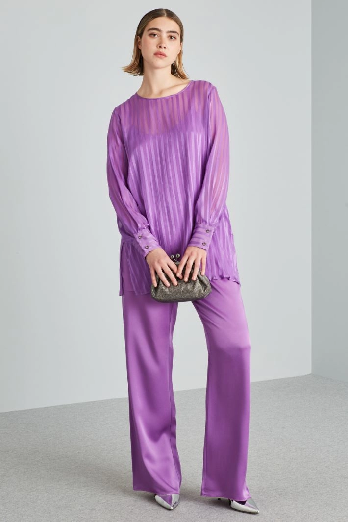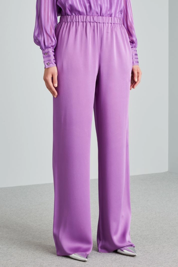 Palazzo trousers in shiny viscose blend envers satin, with elastic insert at the waist.