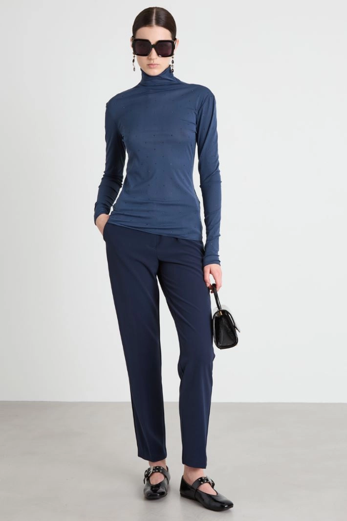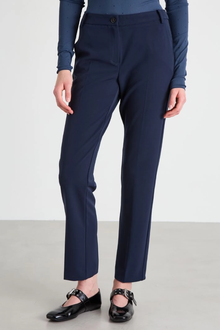 Straight-cut trousers in stretch twill fabric, with belt loops, French pockets and pressed crease lengthwise. Zip and button fastening.