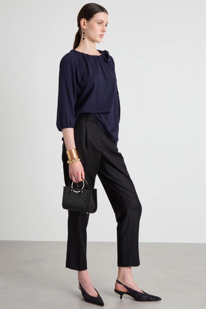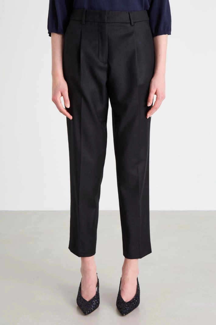 Baggy trousers in lightweight stretch wool flannel, with belt loops, pleats, French side pockets and double welt pockets with brass on the back, and pressed crease lengthwise. Hidden fastening with zip, button and hook.