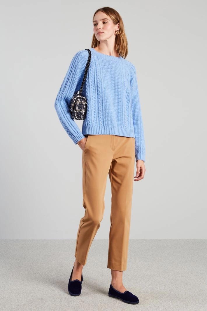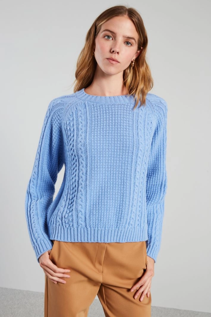 Crew neck sweater in pure wool yarn with long raglan sleeves and multi knit pattern.