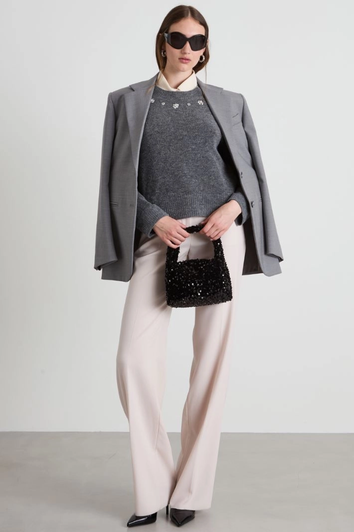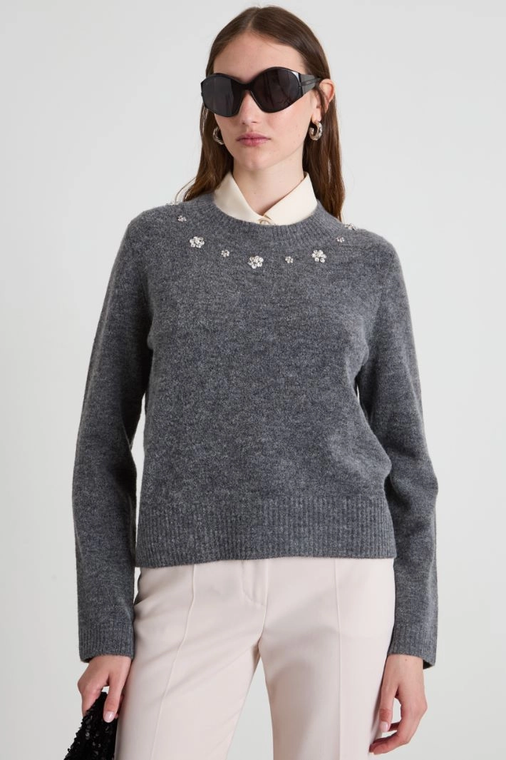 Regular-fit sweater in stretch yarn, with rhinestone and pearl motif embroidered on the front, crew neck, long sleeves and ribbed trim.