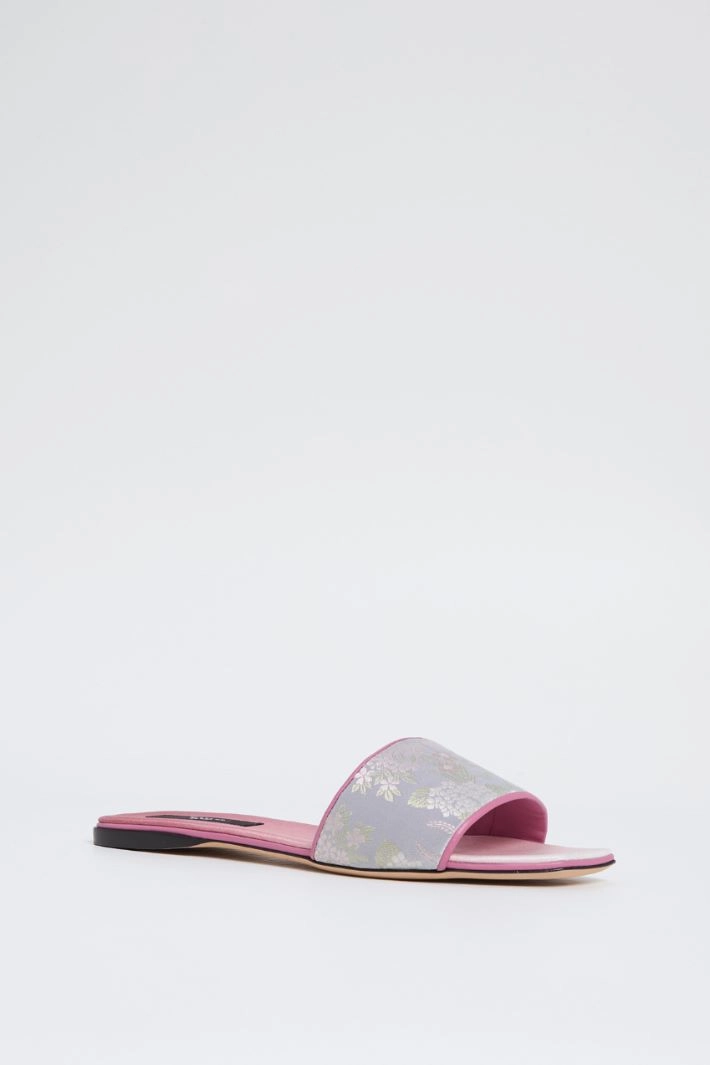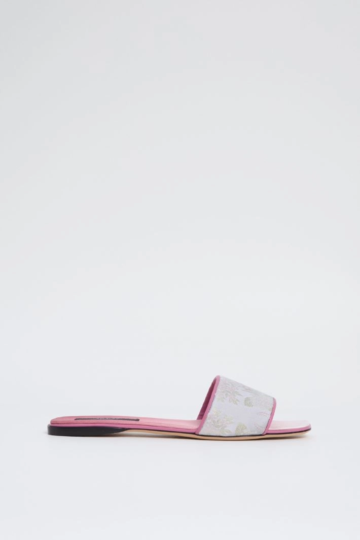 Slippers in jacquard silk fabric and natural fibers with high band. Lining and sole in real leather.