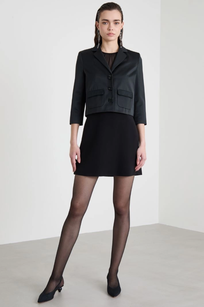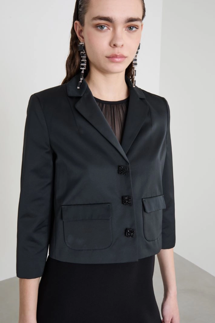 Straight-fit jacket in heavy cotton-blend duchesse, with lapel collar, three-quarter sleeves with vent and patch pockets with flap. Fastening with embroidered snap buttons.
