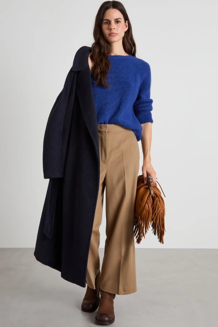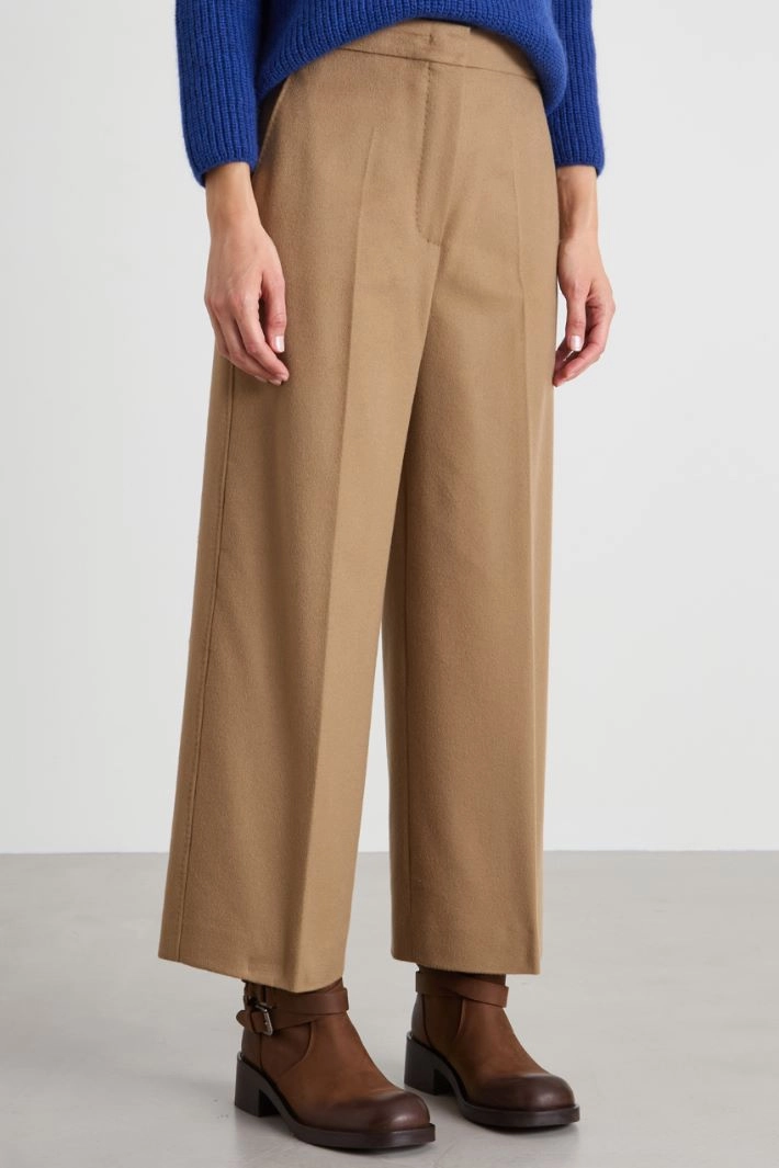 Cropped trousers with a straight fit in pure wool drap, with topstitching, side French pockets, crease along the length and hidden fastening with zip, button and hook.
