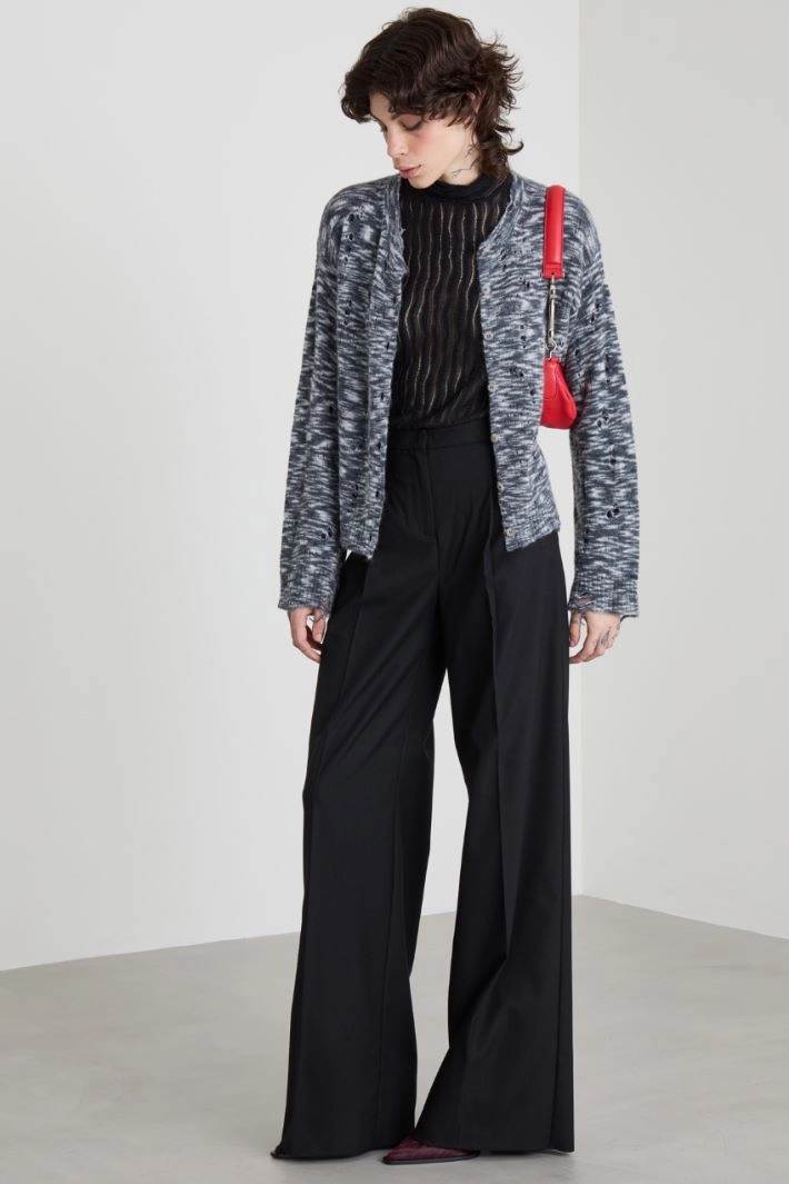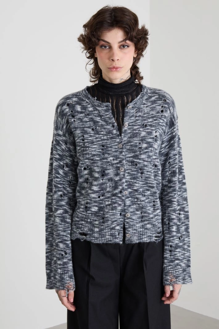 Regular-fit cardigan in alpaca and wool yarn, with openwork and frayed details, crew neck, long dropped sleeves and ribbed trim. Fastening with visible buttons.