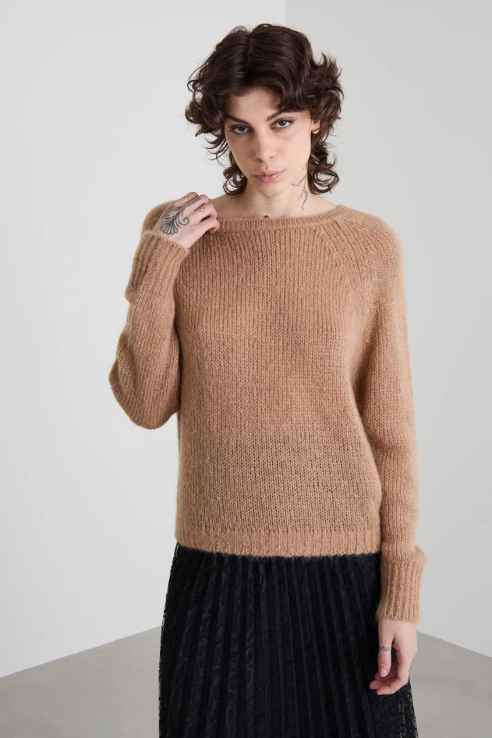 Loose-fit sweater in brushed wool and mohair blend yarn, with round neckline, long raglan sleeves and ribbed trim.