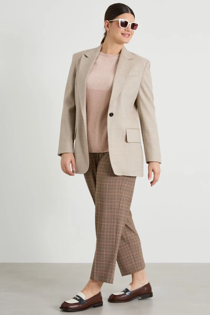 Straight-cut sweater in viscose and wool blend yarn with a round neckline and long raglan sleeves.