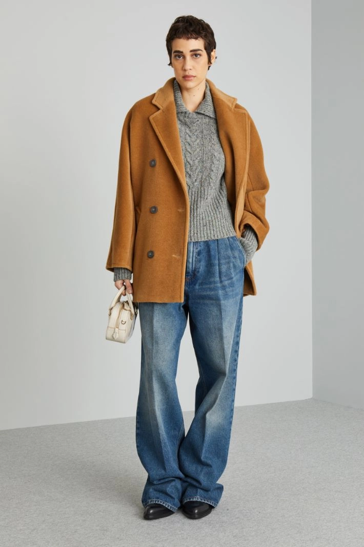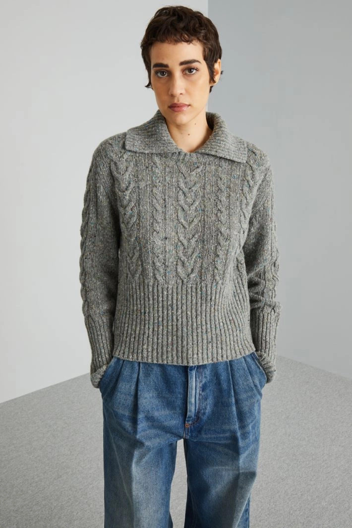 Regular-fit sweater in knop wool and viscose blend yarn, with cable and ribbed stitch, shawl collar and long sleeves.